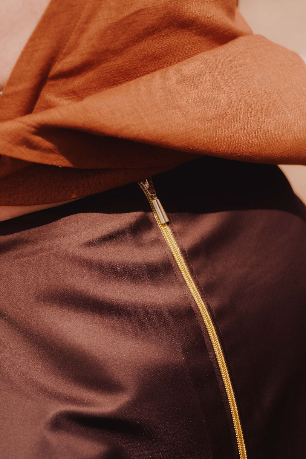A saia evasé de 100% seda pura, robusta de caimento estruturado.