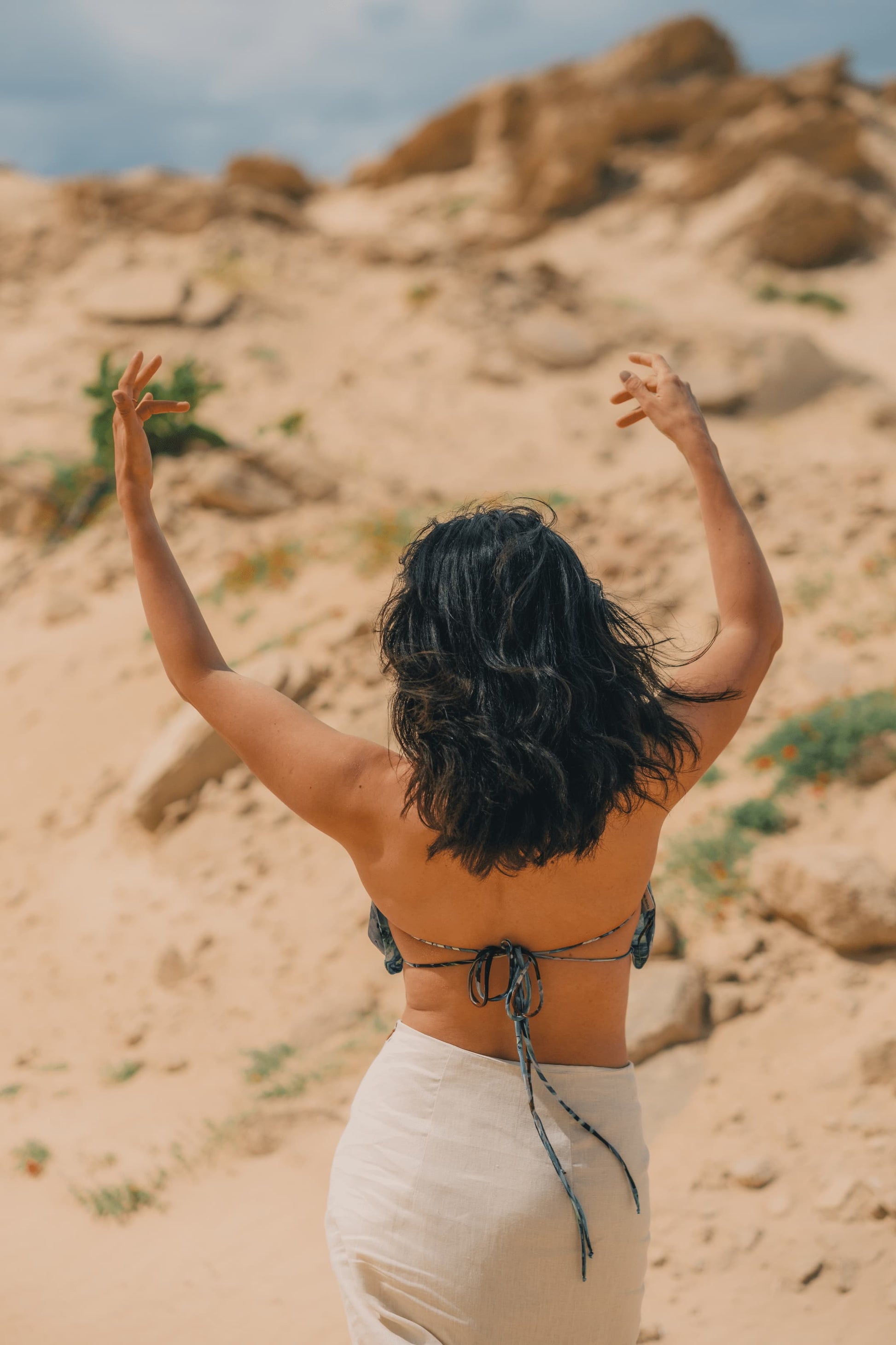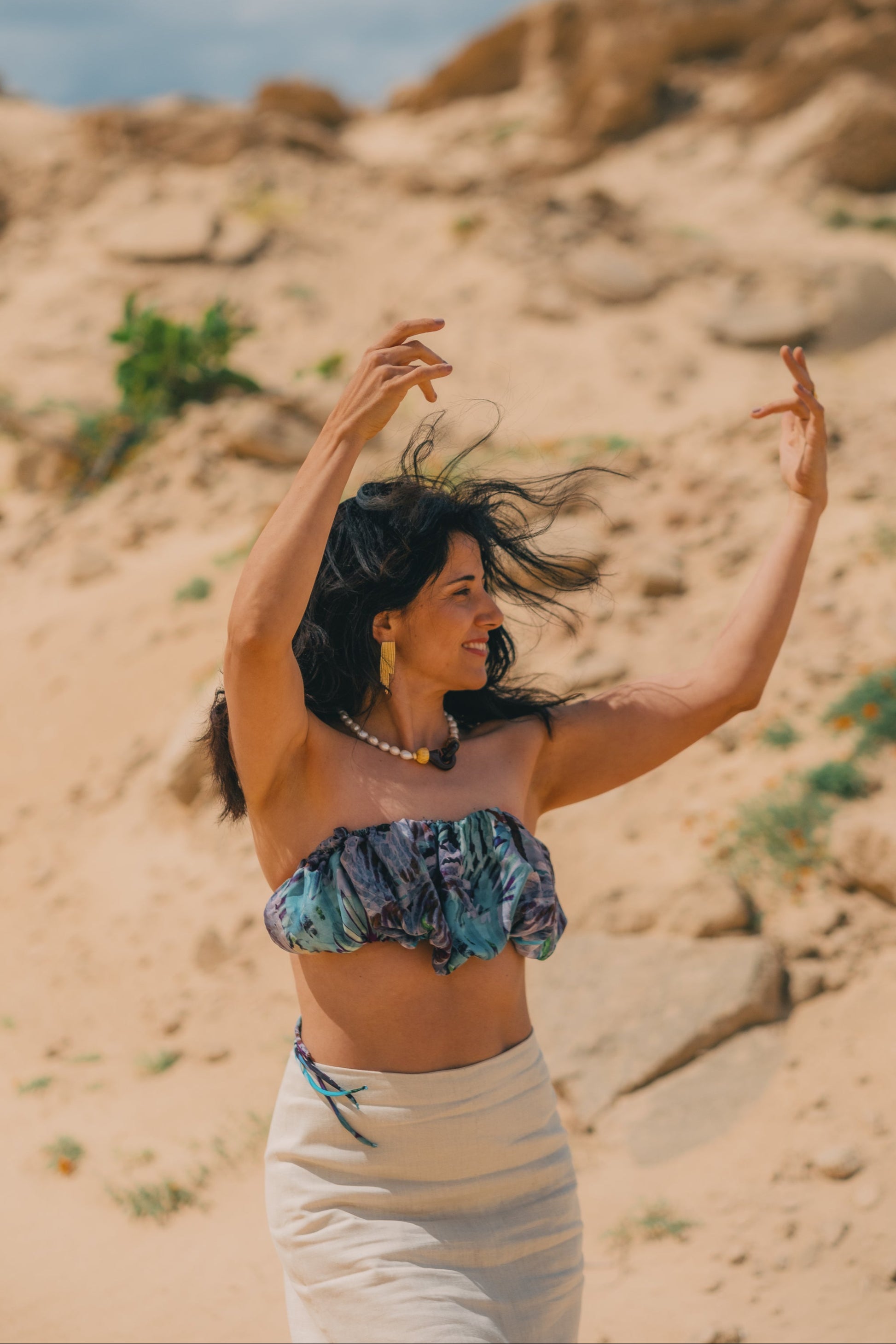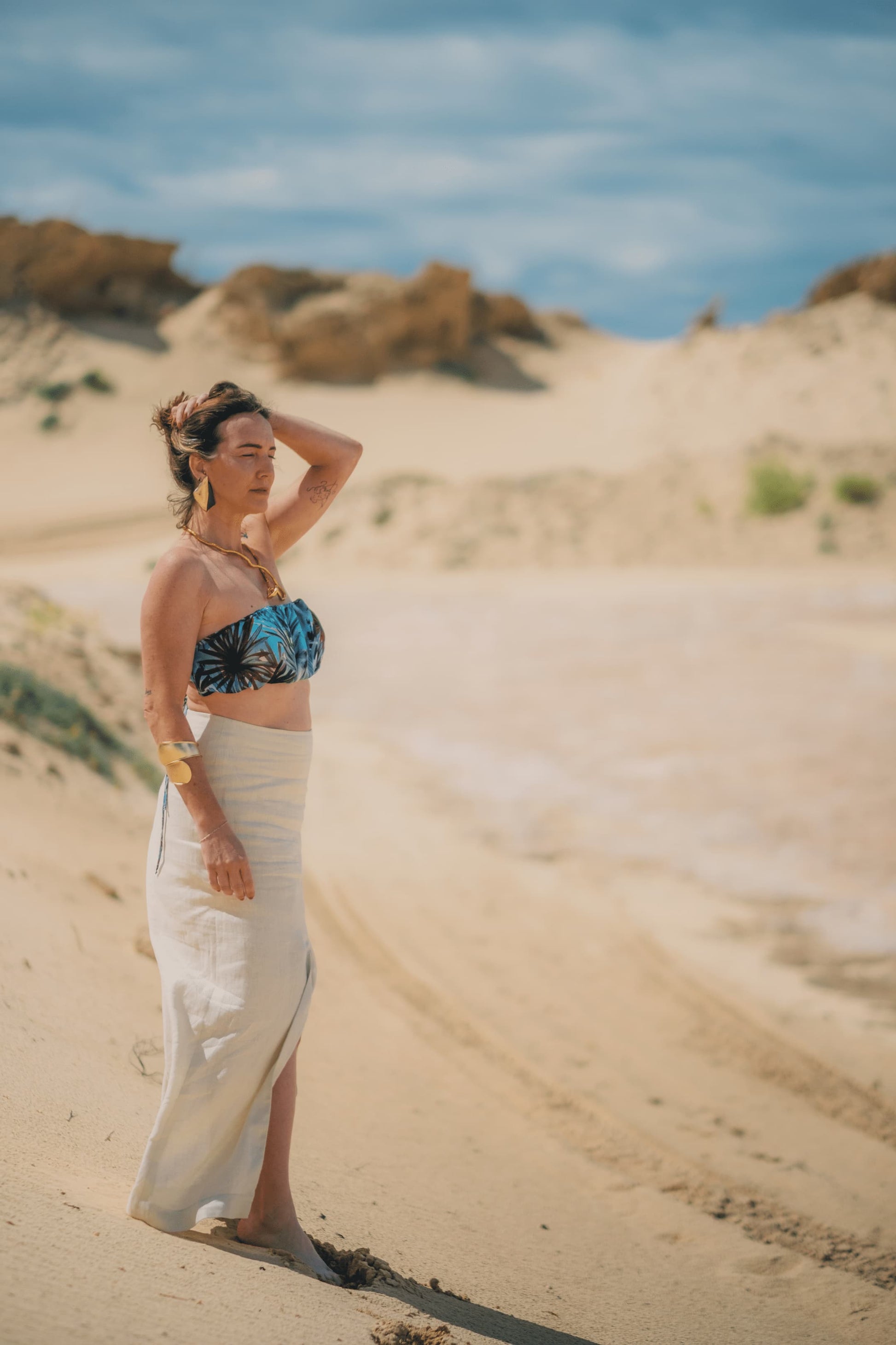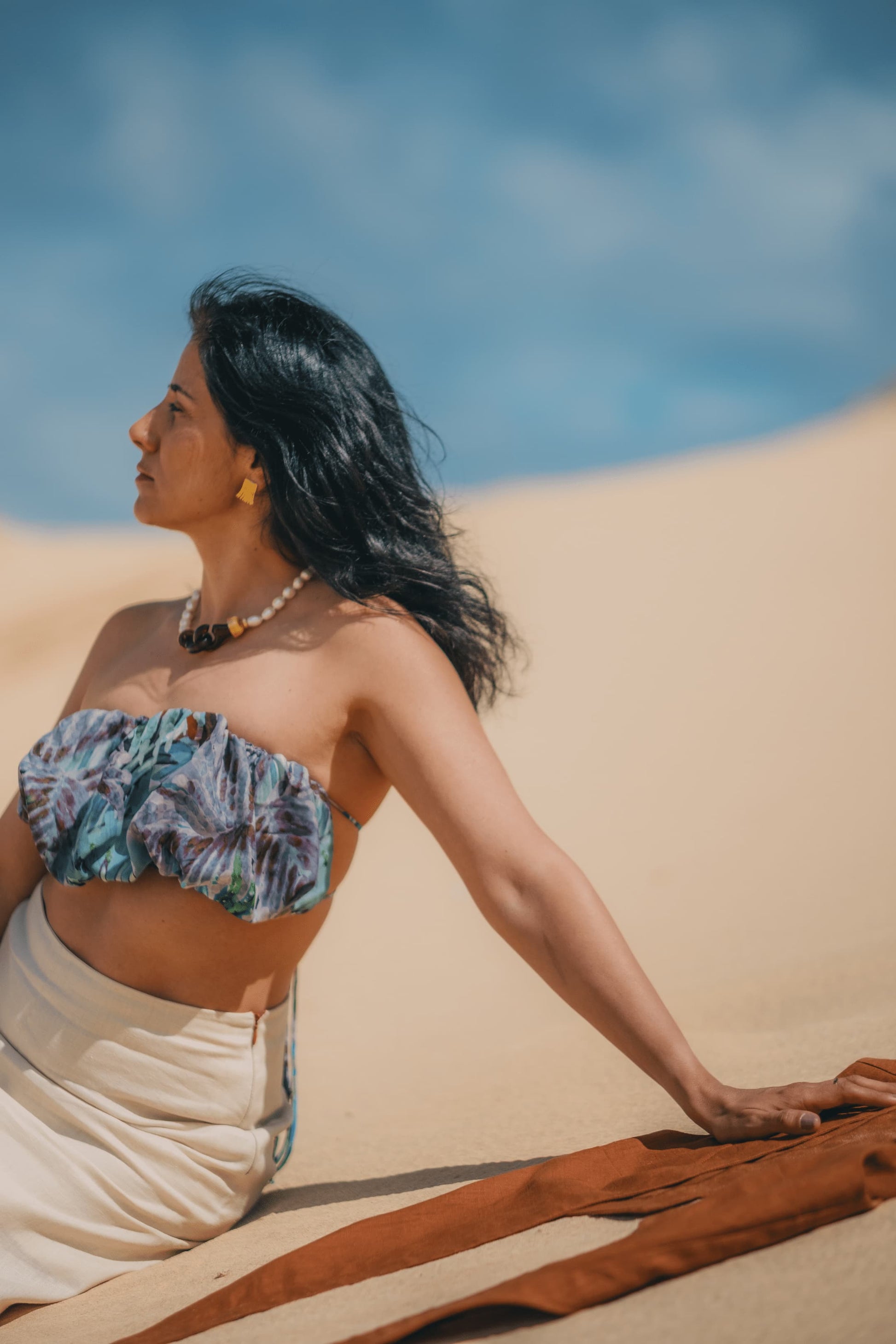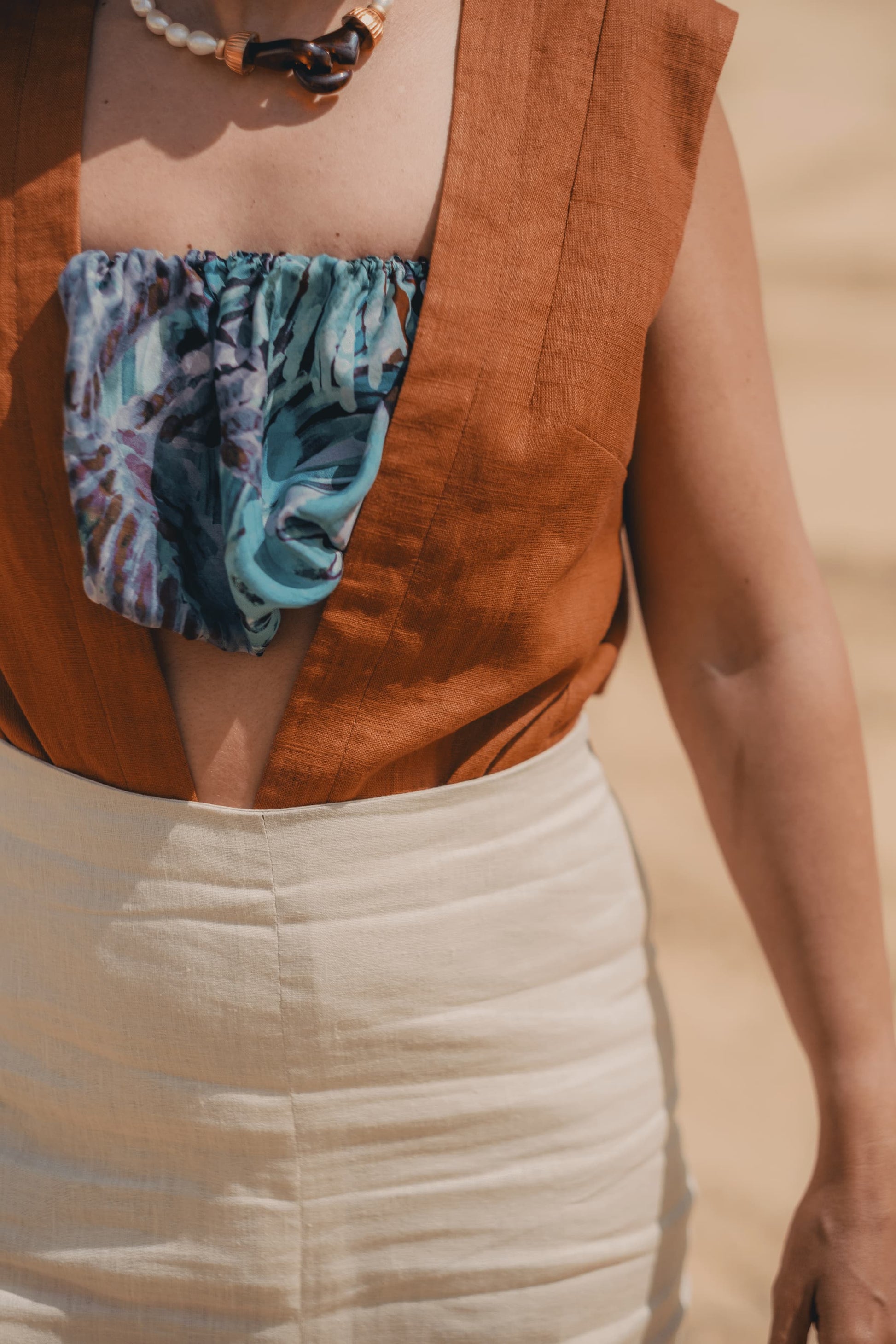 O top Lâmina em 100% seda, aconchega o teu peito e transporta com ele as cores que se atrevem neste Deserto Ilha Dourada. Conjuga com o colete e saia Lâmina e fica lindo apenas sobre o peito.