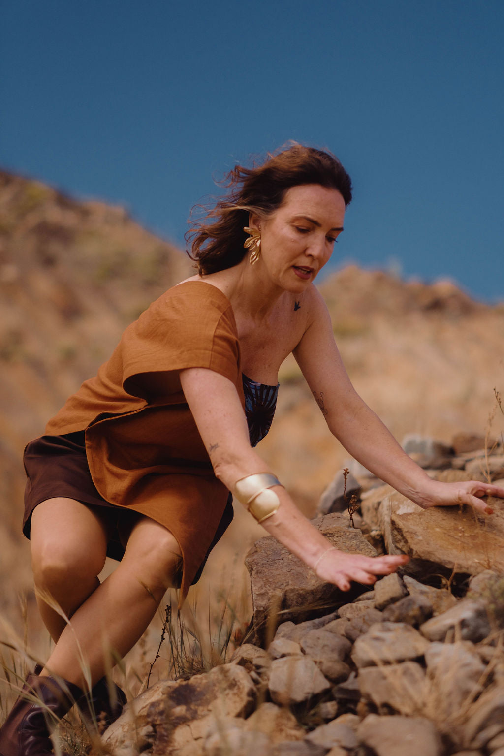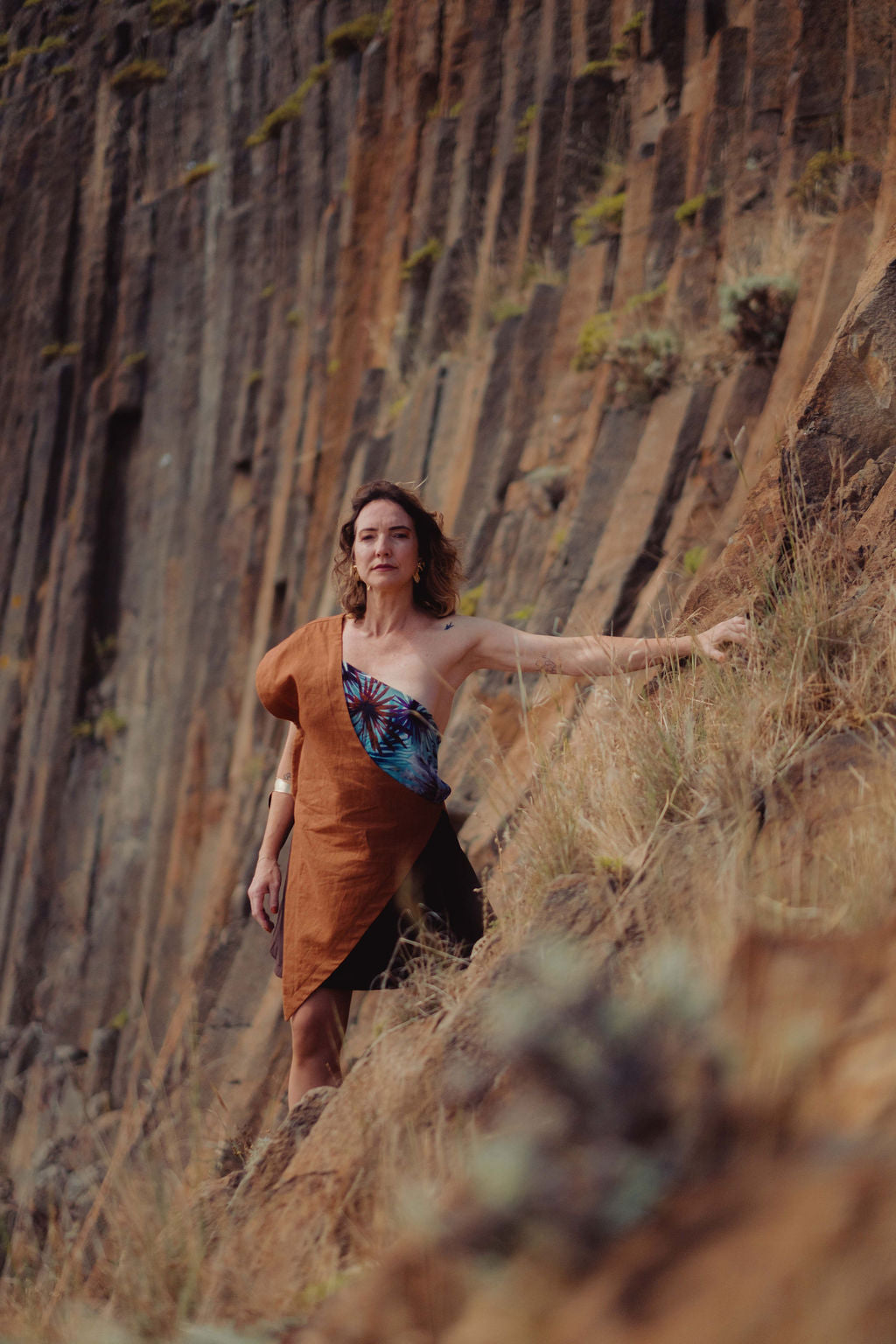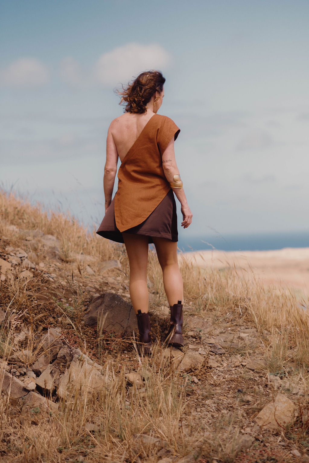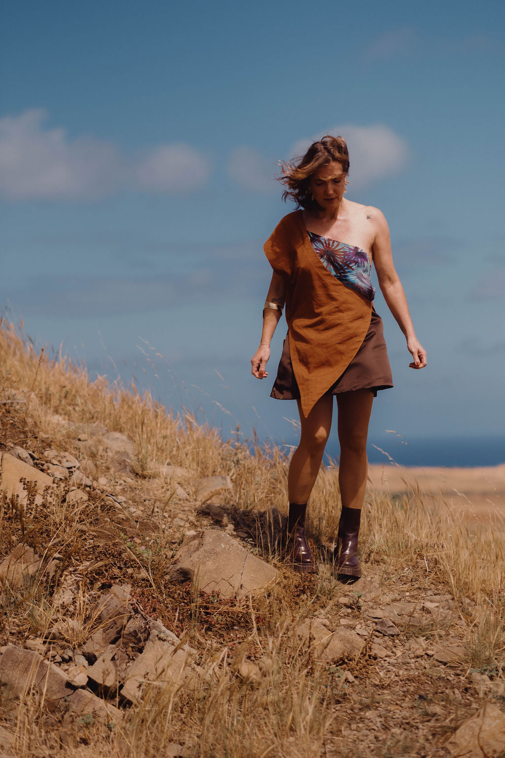 O top assimétrico em 100% linho castanho e 100% seda com o padrão da flora da ilha do Porto Santo. Conjuga com a saia evasé Ana Ferreira.
