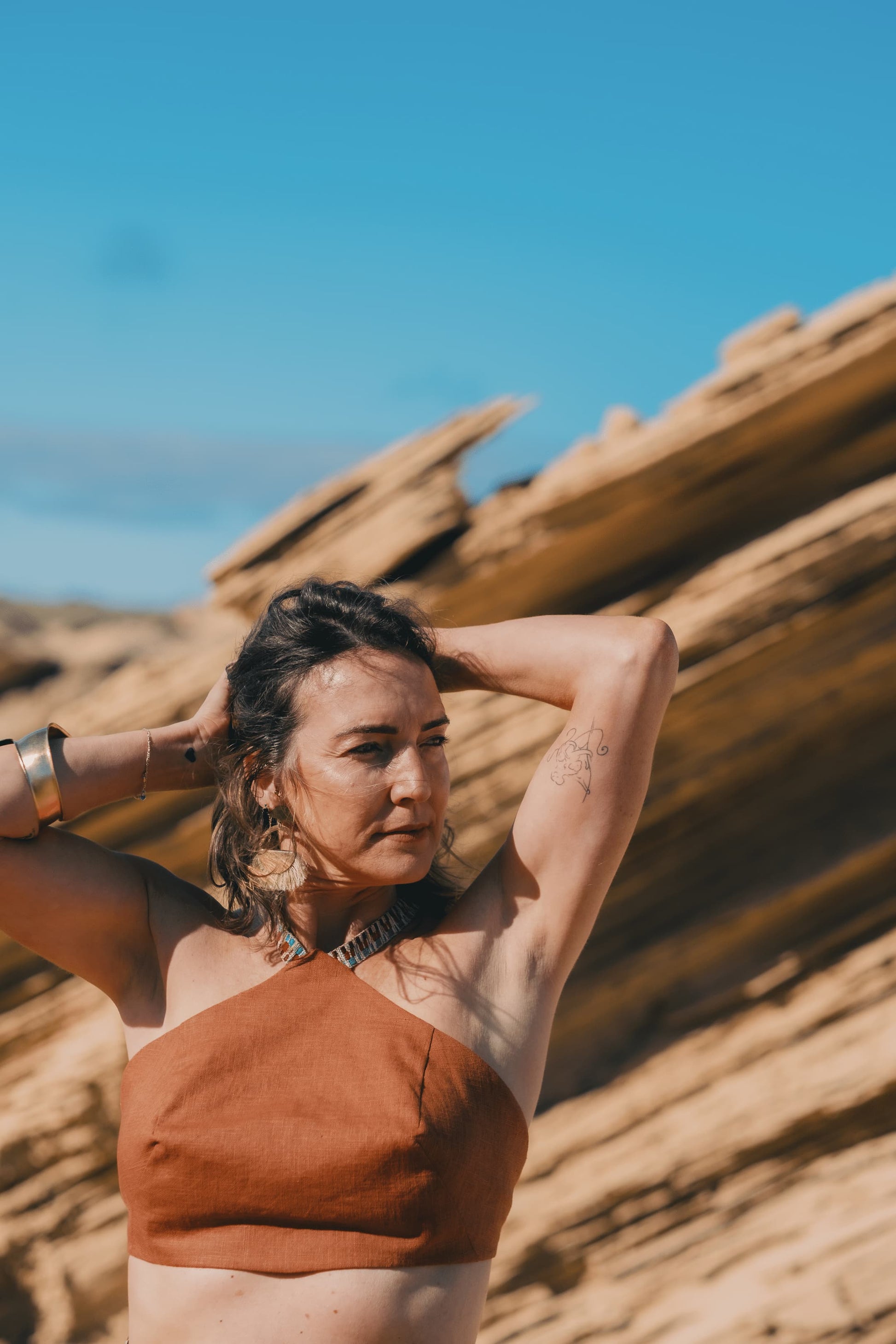 O jumpsuit "Ventos Cruzados" em 100% linho castanho, maleável, com tiras em jacquard.